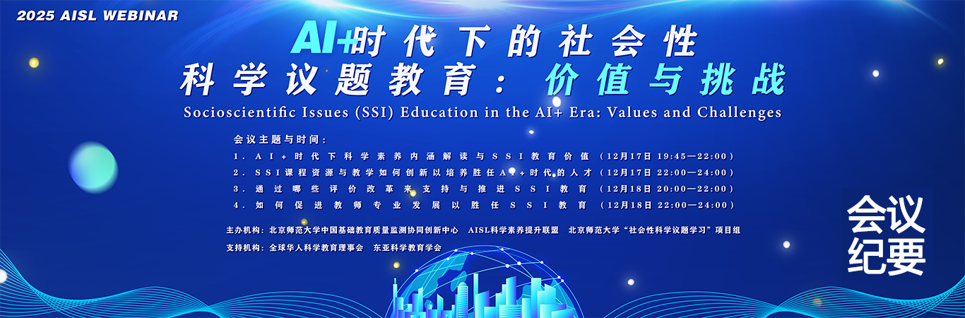 新闻动态 | News 中小学生科学素养提升十五五规划暨中国青少... 2026年1月18日,中国青少年科技教育工作者协会科技与社会教育专业委员会(筹)发起人研讨会在北京师范大学京师大厦召开。来自科学研究领域、高等教育领域和中小学科学教育领域的15... [ 详情 ] 通知公告 | Notices 北京师范大学“社会性科学议题学习”(SS... 社会性科学议题(Socioscientific Issues, SSI)作为科技与社会交织的复杂开放议题,既是培育青少年核心素养的优质载体,更是落实科学教育“加法”的关键路径。... [ 详情 ] 热点推送 | Hotspot 【专题】社会性科学议题教育研究 专题主持:顾明远社会性科学议题教育:国际趋势与本土探索-丁邦平 邴 杰 苏 洵社会性科学议题教学的主题、目标与策略 [ 详情 ]