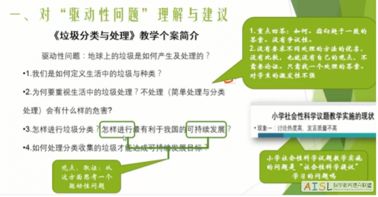 曹春浩从驱动性问题这一视角出发,对该个案的设计进行了点评。他指出,SSI-L的驱动性问题应该具有核心性、矛盾性、争议性、论证性。学生的兴趣不强,是因为驱动性问题的核心性和争议性不够,没有充分激发学生参与,因此要尽量提出一些可以从多角度回答的复杂问题。学生在获取答案的过程中,需要利用多种方法进行取证和论证,实现科学思维的发展。同时也要注意,驱动性问题与分问题之间是存在逻辑关系的,分问题要服务于驱动性问题。以《垃圾分类与处理》这一议题为例,驱动性问题可以是“是否要建设垃圾焚烧发电厂?”,分问题可以设置为烧的是什么垃圾(垃圾分类)?烧的过程与结果是否环保(垃圾处理)?