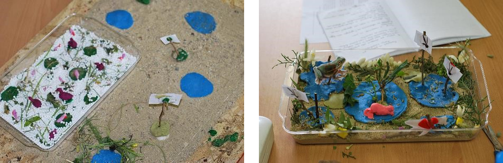 在第6节课和第8节课中,学生以小组为单位,根据实地考察期间收集的数据、绘图和信息等开展工作。他们用自己选择的材料,建造了一个盐湖的三维物理模型。每个小组都展示了他们的模型,为自己选择的材料和表征符号进行辩护。如图所示,在他们的设计中,蓝色部分是盐湖的水,你还可以看到植物,你还可以看到湖中生物的模型。上面那个是他们在湖里发现的虾。你还可以看到青蛙和蚊子。