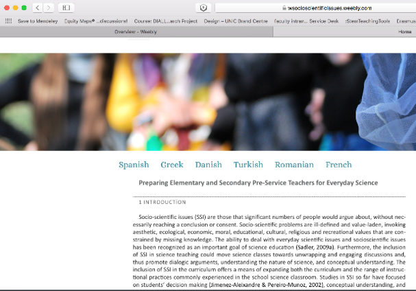 第二个是PreSEES项目(https://wsocioscientificissues.weebly.com)。这一项目旨在培养为了日常生活的科学教育者。这个项目强调为职前教师提供资源来教授社会性科学议题。你可以在这里找到不同的单元。其中一个单元是关于如何支持这些教师评估社会性科学议题。同样的,你可以下载材料。这些材料有不同的版本,有英语版本,也有其他语言版本。