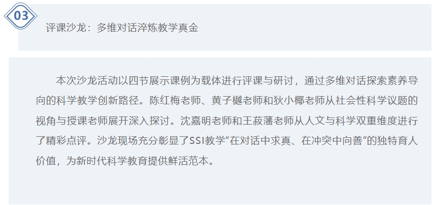 The salon activity utilized the four demonstration lessons as a foundation for review and discussion, exploring innovative pathways for literacy-oriented science teaching through multidimensional dialogue. Teachers, including Chen Hongmei, Huang Ziyue, and Di Xiaoye, engaged in in-depth discussions with the presenting teachers from the perspective of socio-scientific issues. Shen Jiaming and Wang Shufan offered insightful commentary from the dual dimensions of humanities and science. The salon fully showcased the unique educational value of SSI teaching—“seeking truth through dialogue, pursuing goodness through conflict,” which provides a vivid model for science education in the new era.