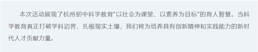 This event showcased the educational wisdom of Hangzhou junior high science education, with “society as the classroom and literacy as the goal.” When science education genuinely transcends disciplinary boundaries and is grounded in real-world contexts, we will play a role in cultivating talents with innovative spirit and practical abilities for the new era.