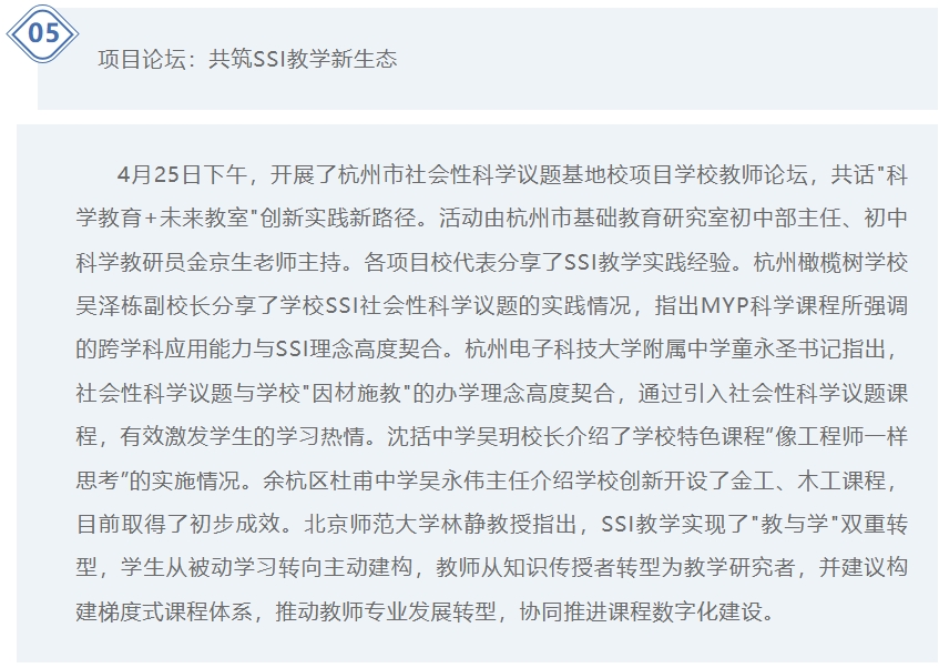 On the afternoon of April 25, the Hangzhou SSI-L Project School and Teacher Forum was held to discuss new pathways for innovative practices in “Science Education + Future Classroom.” The event was hosted by Jin Jingsheng, Director of the Junior High Department of the Hangzhou Basic Education Research Office and Junior High Science Education Researcher. Representatives from project schools shared their experiences with SSI teaching practices. Wu Zedong, Vice Principal of Hangzhou Olive Tree School, shared the school’s SSI practice, noting that the interdisciplinary application skills emphasized in the MYP science curriculum align closely with the SSI philosophy. Tong Yongsheng, Party Secretary of Hangzhou University of Electronic Science and Technology Affiliated Middle School, stated that socio-scientific issues align closely with the school’s “tailored education” philosophy, effectively inspiring students’ enthusiasm for learning through the introduction of SSI courses. Principal Wu Yue of Shen Kuo Middle School introduced the school’s signature course implementation, “Thinking Like an Engineer.” Director Wu Yongwei from Dufu Middle School in Yuhang District introduced the school’s innovative metalworking and woodworking courses, which have seen preliminary success. Professor Lin Jing noted that SSI teaching achieves a dual transformation of “teaching and learning,” with students shifting from passive learning to active construction and teachers transitioning from knowledge transmitters to teaching researchers. She suggested building a tiered curriculum system, promoting the transformation of teachers’ professional development, and collaboratively advancing digital curriculum development.