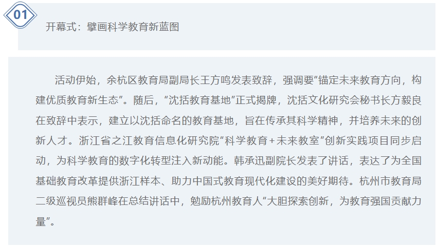At the beginning of the event, Wang Fangming, Deputy Director of the Yuhang District Education Bureau, delivered his remarks, emphasizing the need to “anchor the direction of future education and build a new ecosystem for quality education.” Subsequently, the Shen Kuo Education Base was officially unveiled. Fang Yiliang, Secretary-General of the Shen Kuo Cultural Research Association, stated in his address that establishing an education base named after Shen Kuo aims to inherit his scientific spirit and cultivate future innovative talents. The Zhejiang Zhijiang Education Informatization Research Institute’s “Science Education + Future Classroom” innovative practice project was launched concurrently, injecting new momentum into the digital transformation of science education. Deputy Director Han Chengxun delivered a speech, expressing hopes of providing a Zhejiang model for national basic education reform and contributing to the modernization of Chinese-style education. Xiong Qunfeng, Level-II Inspector of the Hangzhou Education Bureau, in his concluding remarks, encouraged education practitioners in Hangzhou to “boldly explore innovation and contribute to building a strong power through education.”
