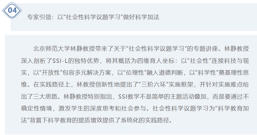Professor Lin Jing from Beijing Normal University delivered a keynote speech on “Socio-Scientific Issues-based Learning.” Professor Lin explored and analyzed the unique benefits of SSI-L, summarizing it as a four-dimensional educational framework: connecting technology and reality through “sociality,” embracing diverse solutions through “openness,” incorporating moral judgment through “ethicality,” and grounding rational thinking through “scientificity.” In terms of practical pathways, Professor Lin innovatively proposed a “three-stage, six-step” implementation framework and outlined three key strategies to tackle implementation challenges. Professor Lin particularly emphasized that SSI teaching is not merely the accumulation of thematic activities; rather, it stimulates students’ deep thinking and social engagement through uncertain contexts. Socio-scientific issues learning offers a systematic practical pathway for enhancing the quality and effectiveness of science education within the framework of “enhancing science education.”